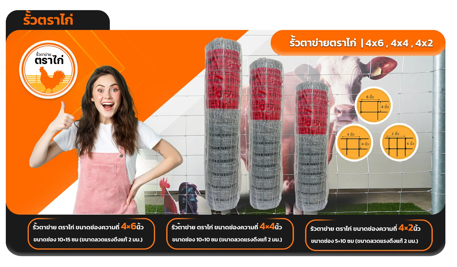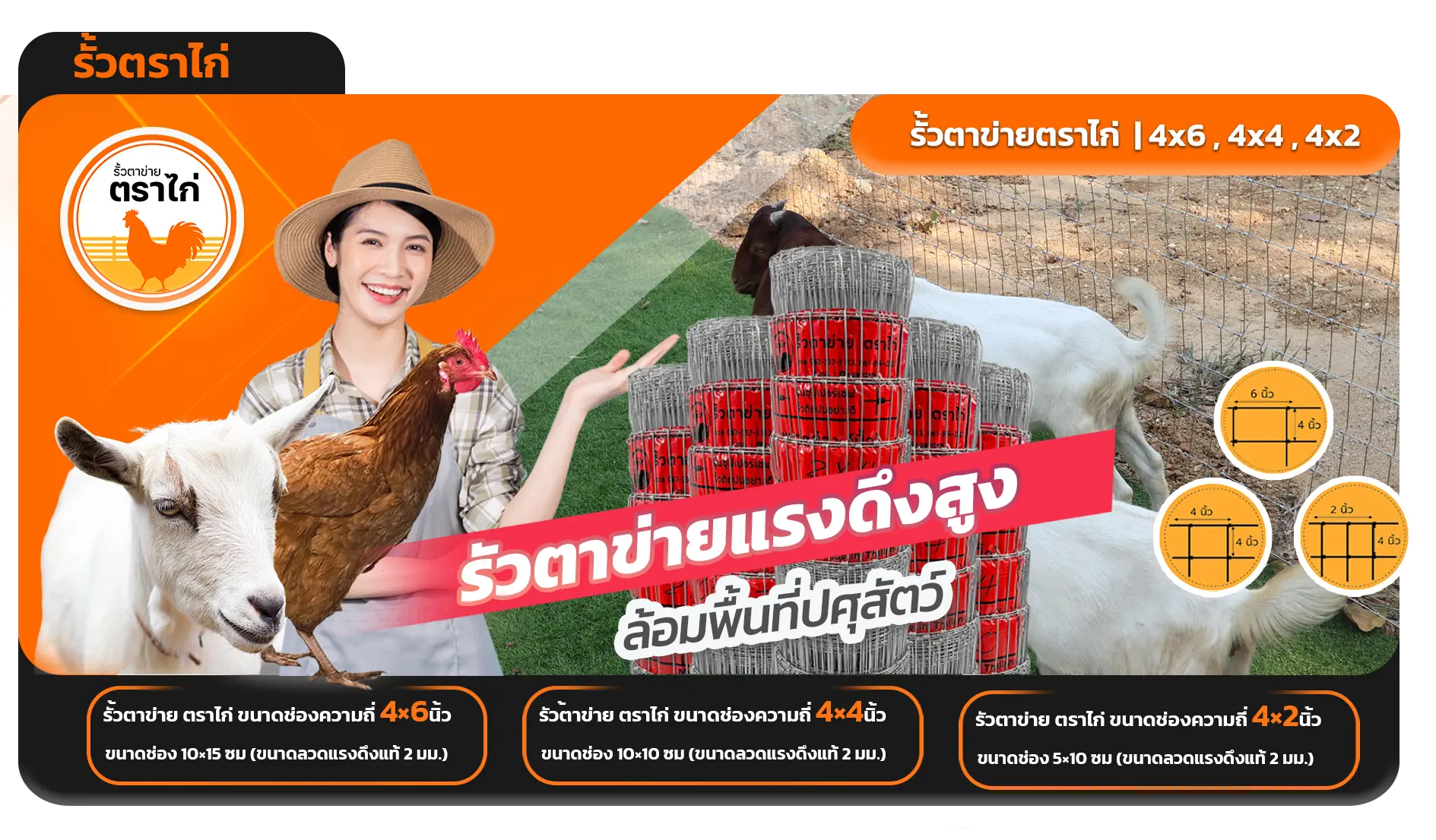 รั้วตาข่ายตราไก่ รั้วดี มีคุณภาพ เพื่อเกษตรกรไทย ขนาดช่อง 10×10 ซม. ช่องห่างกำลังดี เหมาะกับทำคอกสัตว์ เช่น แพะ แกะ วัว และกระบือ (ขนาดลวดแรงดึงแท้ 2 มม.)