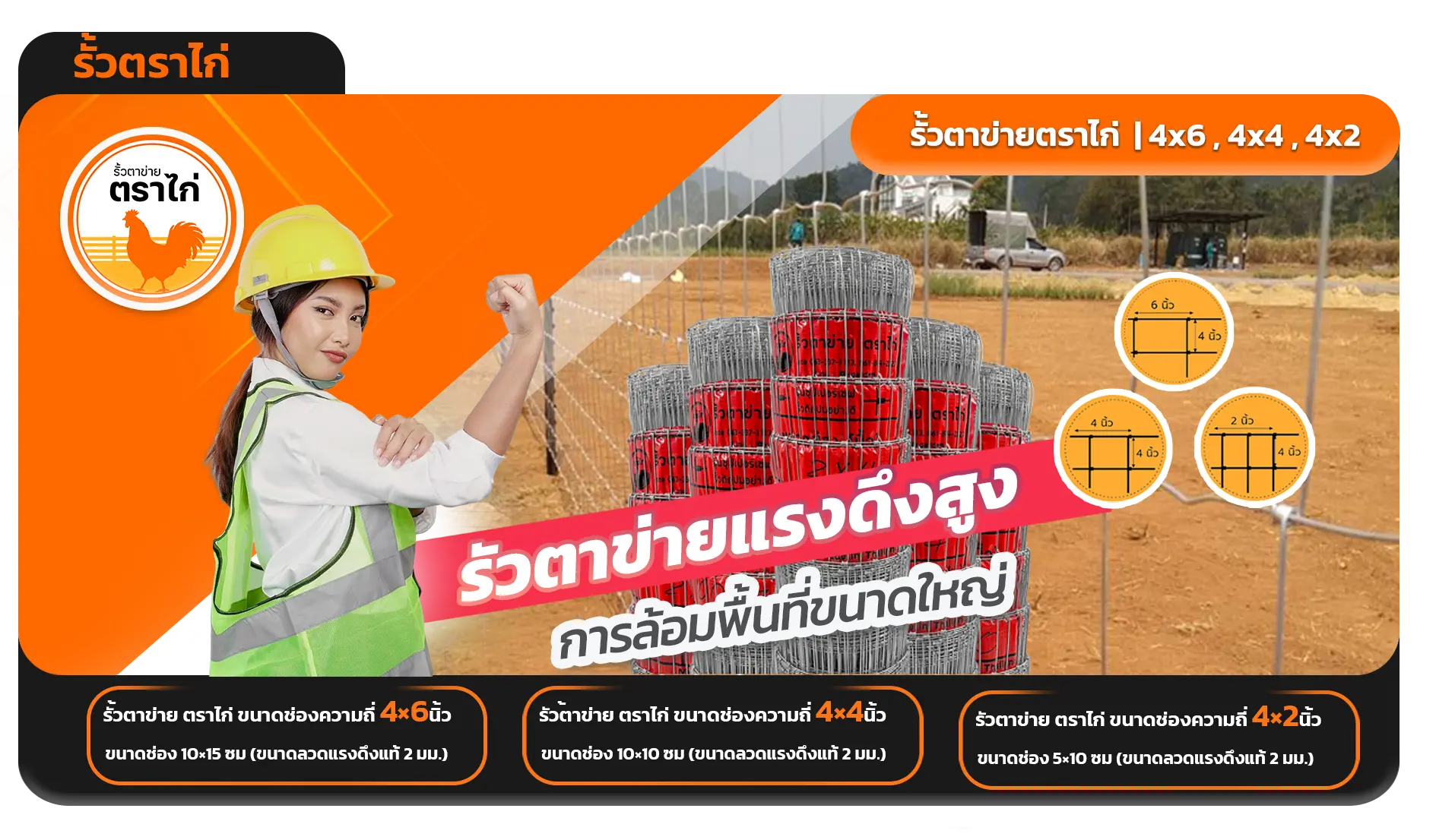 รั้วตาข่ายตราไก่ รั้วดี มีคุณภาพ เพื่อเกษตรกรไทย ขนาดช่อง 10×15 ซม. ช่องแนวนอน ช่องใหญ่สุดในรุ่น เป็นรุ่นสุดคุ้มเหมาะกับเสี้ยงใหญ่ หรือล้อมบ้าน ล้อมพื้นที่ (ขนาดลวดแรงดึงแท้ 2 มม.)